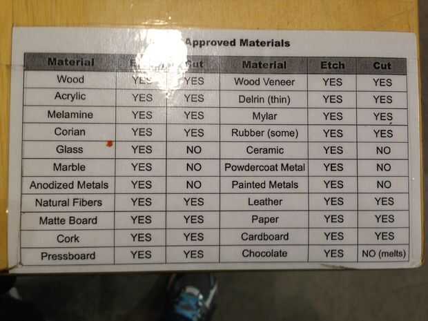 Siempre Compruebe para asegurarse de que usted quiere cortar puede ser procesado por el cortador del laser; hay algunos materiales que simplemente no se cortan, pero otros se derretirán, produce gas que puede dañar la lente del laser, o producir gas tóxico si cortar. A continuación están los materiales aprobados para la Trotec. Otra vez, no todos los laser cortadores son los mismos. Por favor compruebe que su material está bien para su particular cortador antes de cortar cualquier cosa.