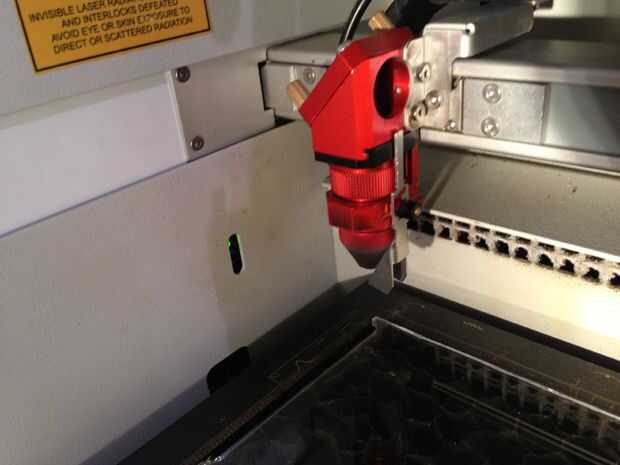 Hay una cresta en el lado de la cabeza láser. Con los pies de la herramienta enfoque apuntado hacia abajo, equilibrar cuidadosamente el metal cuadrado en ese saliente. Asegúrese de que el láser es lo suficientemente lejos de la cama de apoyo que los pies de la herramienta de enfoque no está tocando el material. También asegúrese de que el láser se coloca sobre el material, no los gobernantes. Utilice el teclado de control para mover la cabeza láser si es necesario.