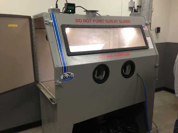 Una cabina de granallado como este es un buen recurso para este proceso. El espacio cerrado le permite trabajar sin separarse mucho de partículas y protege las manos de la explosión.