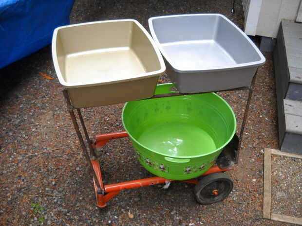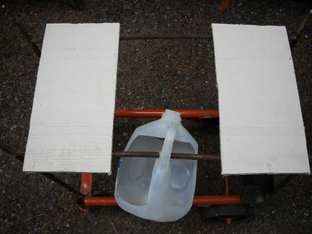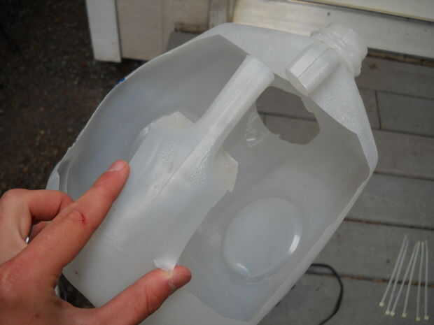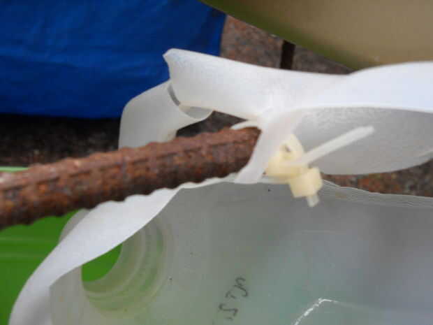 Una vez que el marco se hace corte y sujete el contenedor de leche. Cortan el mango, cortar una abertura grande en el lado de la manija y corte una abertura pequeña en la parte superior del otro lado. Se trata de un embudo para que el agua que sale de las camas de crecimiento. Fíjelo al marco con una atadura a través de la empuñadura y en la barra de acero.