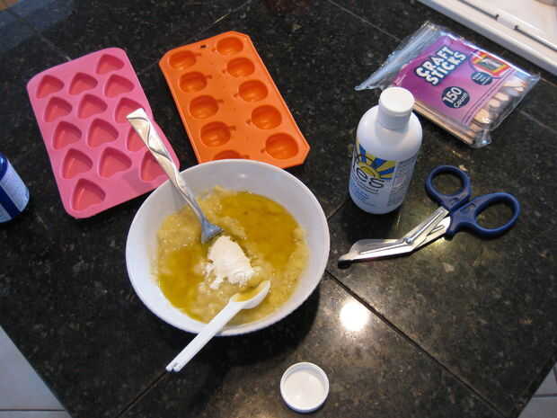 Calcular cuánto probiótico por día, yo use aproximadamente 1/8 a 1/4 cucharadita (dependiendo de la etiqueta) por hielo pop; así 20 x 1/8 cucharadita = 2 1/2 cucharadita de polvo de probióticos para el lote. Mezclar en el puré de plátano.
