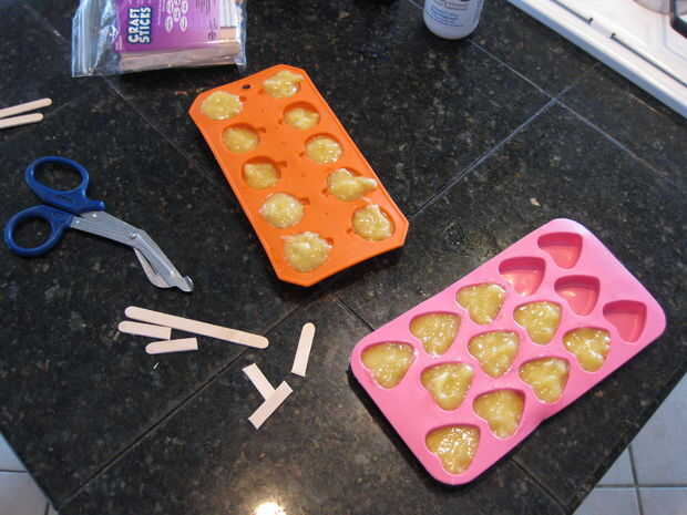 Finalmente corte algunas ramitas de madera hielo pop a un tamaño mini (una vez traté de palillos de dientes, pero los niños no como los puntos agudos) e inserte los palitos en cada molde.