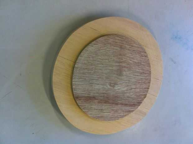4. cortar la plancha en un disco de diámetro más pequeño y pégalo en la parte inferior del 3er disco de madera.