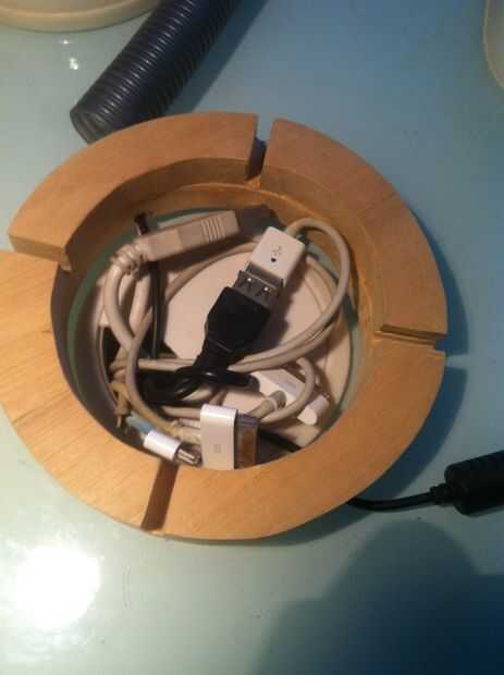 Uso: 5. Coloque el cilindro como tal en la parte superior la salida de cable. 6. Coloque todos los cables dentro del cilindro 7. Cubrir la parte superior para ocultar todos los cables. 8. los Cables se toman hacia fuera para cargar dispositivos cuando sea necesario.