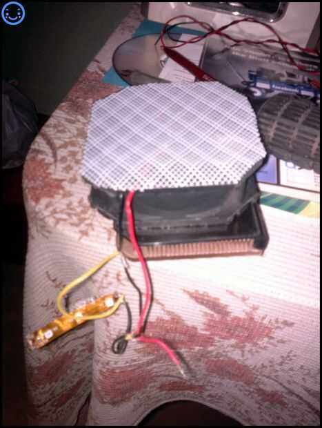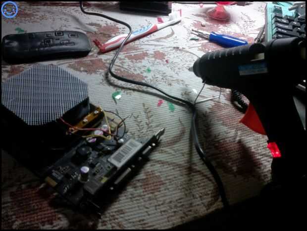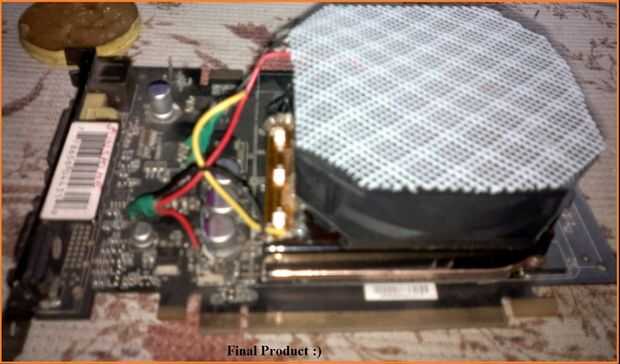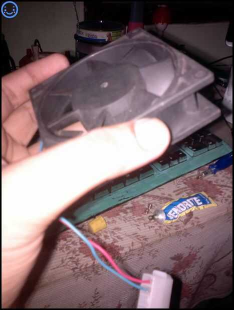 Tome un ventilador 80 mm, asegúrese de que el ventilador sólo tiene dos cable, donde generalmente el negro es negativo y el otro color es positivo, si el ventilador no viene con cable negro entonces encontrar el cable negativo y positivo. Ahora toma el pegamento caliente / otros adhesivo duro como dendrita o algo como eso y hacer una capa en el ventilador y pegarlo sobre el plástico de la cubierta del disipador de calor. Ahora esperar algún tiempo. Entonces si usted quiere usted puede pegar un polvo libre de red sobre el ventilador (opcional)