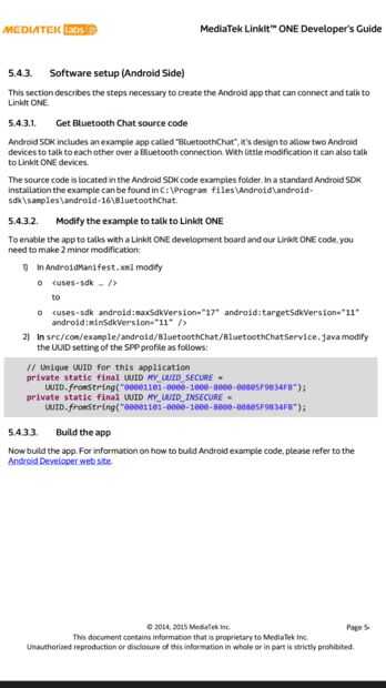 Nota: El cambio principal que permite aplicaciones de BT trabajar con el ONE de LinkIt se da en la guía de los desarrolladores. He adjuntado una captura de pantalla de por encima. Puede verlo y cambiar en sus propias aplicaciones, como aconsejado por Instructable usuario "IAmBruce". Junto con eso, también he cambiado la interfaz de la aplicación de chat bluetooth según las directrices de diseño de material, que es totalmente opcional si usted desea hacer sus aplicaciones trabajar con bluetooth interno de LinkIt uno.