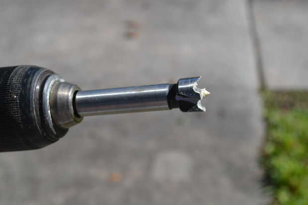 Marcado los ángulos, averiguado el espacio necesario y me puso a trabajar. Idealmente un taladro mejor sería ir, pero como no tengo uno, mi taladro con un broca Forstner 5/8" fue muy bien. Sólo trate de mantenerse perfectamente vertical como sea posible.