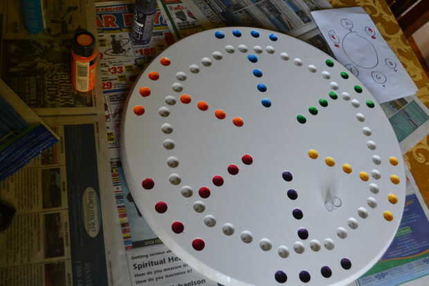Lijado, un poco de relleno de madera donde se necesita y luego un blanco limpio agradable. Entonces los propios colores en sus respectivas ' empezar "y"Casa". Luego de 3 capas de poliuretano para protección y brillo. :)