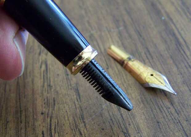 Mi esposa me dio esta pluma diplomático un año para la Navidad. Dijo que ella consiguió realmente mucho en él. Nunca pude conseguir que escriba. Me pareció muy poco aire capaz de volver a entrar a la reserva (un cartucho), por lo que he cometido un gran error y cortar una pequeña ranura del canal en el alimentador al exterior. Más tarde tuve que llenar la ranura pequeña con esmalte de uñas y utilizan el papel sobre una superficie dura para pulirla. Entonces tuve que solucionar el problema real, que era un alimentador pobres a punta de ajuste (ver paso anterior). Ahora es una de las mejores plumas que tengo y un placer de utilizar.