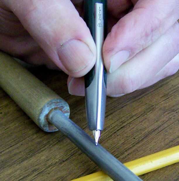 Se trata de una estilográfica Namiki punto de fuga. Cuando la punta se extiende para la escritura, el clip de bolsillo viene entre el pulgar y primer dedo del usuario. Zurdos inclinación una pluma un poco, y eso hace con un bolígrafo de punto de fuga Namiki difícil. En los días cuando las plumas eran muy populares, no era infrecuente tener un punto de tierra para un usuario zurdo. Todavía puede conseguir plumas para los zurdos. Lamy hace uno. Usé un cuchillo muy bien afilado de caña para moler el punto así que funciona mucho mejor para mi escritura para zurdos. Sostenía la pluma como si la superficie de la barra afiladora fueron un pedazo de papel y movió la pluma como si te estuviera escribiendo. Comprobar lo que has hecho a menudo con una lupa. La desventaja de molienda en el punto es que la superficie del punto no es tan suave, aunque esto mejora un poco con el uso.