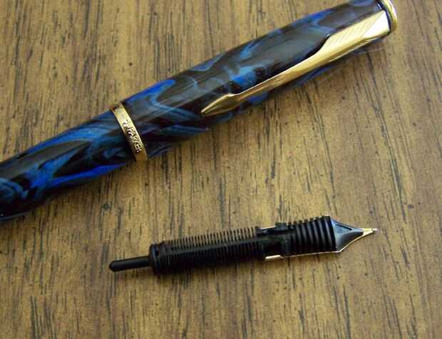 Los dientes de este Parker eran un poco demasiado cercanos junto. La semilla es elástica. La Asamblea de punta se desenrosca de la sección. La punta no se desliza de la alimentación como en la mayoría de plumas, pero se une a él con las pestañas. Destornillador de joyero puede utilizarse para alejar las pestañas así una galga puede ser utilizada para difundir un poco los dientes. En este caso que opté por usar una galga calibre en lugar de simplemente presionando en la parte frontal de la punta. Pero, tratando de difundir las cuchillas girando una galga en la ranura puede resultar en la fabricación de una "V" en la punta entre las dos mitades de la bola de iridio. Consulte el paso 2.