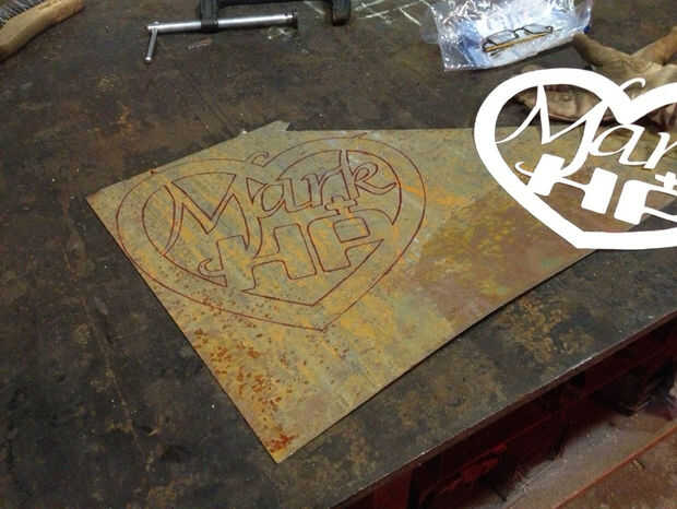 Una vez tuve mi patrón de papel, remonta a en una pieza de acero de calibre 20 ligeramente oxidado. Usé un rotulador rojo para hacer el trazo, que ardió de como corté. Fui rápidamente con el cortador, para conseguir el look antiguo/dificultades por que iba tanto, para minimizar la deformación del acero. Me pareció que una técnica que funcionó bien cortar rápido, cerca del borde asegurándose de que no pase y luego ir hacia atrás y rápidamente pasar a lugares donde había llegado demasiado lejos. He trabajado en secciones pequeñas, cambio de posición a menudo, para no tener que inclinarse demasiado sobre el trabajo y conseguir demasiado tambaleante.