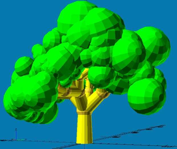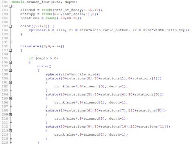 Añadir tres nuevos módulos para diferentes tipos de ramas, donde el árbol se divide en 2, 3 o 4 direcciones. Llaman "branch_two", "branch_three" y "branch_four" (ver mi código de ejemplo para todos los ángulos). Agregar lógica al módulo de "Tronco" para elegir al azar entre ellos. Copie el código de "branch_one" a los nuevos módulos y luego modificar los módulos para que no partido "branch_one", y "branch_three" se divide en tres formas y así sucesivamente. Ahora tienes un árbol de aspecto mucho más aleatorio y menos predecible. Su casi terminado.