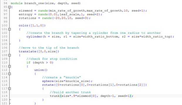 ¿Por qué su árbol representado llegó diferente de la vista previa? OpenSCAD utiliza un generador de números pseudo-random, que medios produce una secuencia predecible de números, dados el mismo a partir del número, o semilla. Ya que no pasa en una semilla, su uso uno al azar. Pasando en la semilla, puede producir resultados predecibles cada vez. En cierto modo, su "crece" de esa semilla. Tienes que pasar la semilla a lo largo de los módulos, o bien se terminan escogiendo los mismos valores al azar en cada iteración y terminar con un aspecto simétrico, antinatural, árbol.