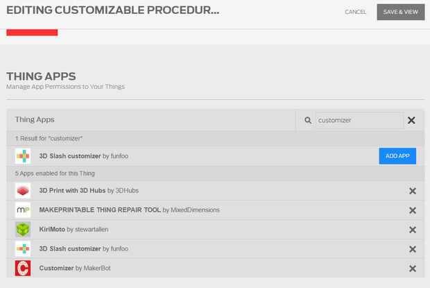 Ahora crear una cosa nueva en Thingiverse, sube tus archivos STL y código OpenSCAD y marque la casilla de "Este es un Personalizador". Asegúrese de que su nombre de la cosa empieza con la palabra "Personalizable". Además, ahora tienes que añadir la aplicación Personalizador explícitamente en la sección de aplicaciones en la parte inferior.