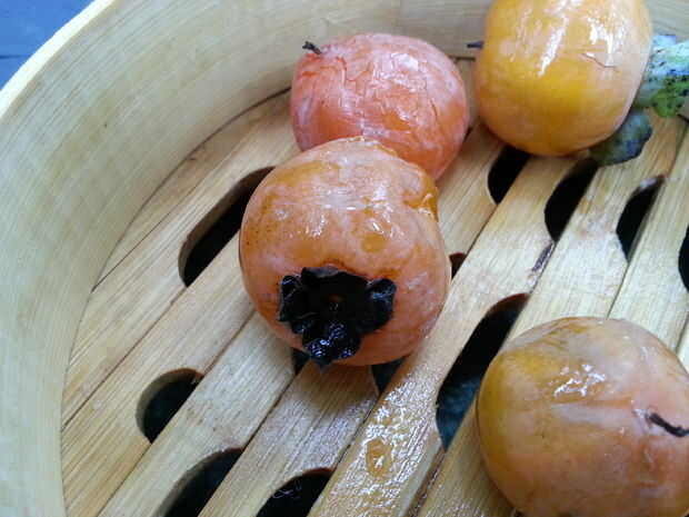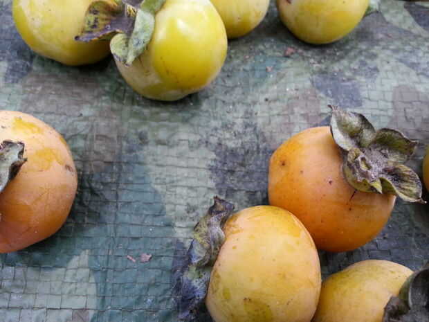 La fruta del árbol del caqui es realmente una gran baya, con semillas de 0 a 8. Cuando inmaduro, es muy astringente, que hace su sensación de boca muy seca y apretada. Es difícil de describir pero inolvidable.