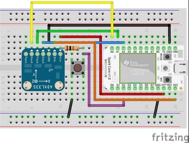 Nos une el acelerómetro para el núcleo de la chispa en un tablero separado y conectado los cables siguientes