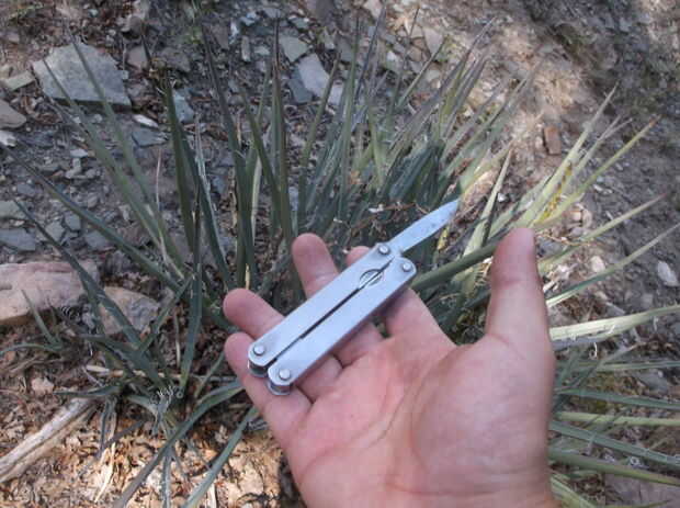 La yuca mejor para la cosecha de la fibra son los que tienen las hojas más largas, más grandes. A menos que usted está haciendo textiles, un enorme paquete de hojas será innecesario que una sola hoja de la yuca produce un poco de fibra utilizable (40% de la masa de la hoja). Para cosechar, doblar una hoja de abajo para que la base de se encuentra contra una roca o el suelo y bash cuidadosamente con su rock de corte hasta que la hoja es cortada.