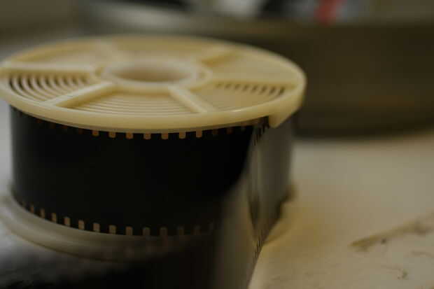 Una vez que haya bloqueado a ti mismo lejos forma la luz fuera de mundo, puede recoge el envase de la película y, usando unas tijeras, pegar una pata en la raja que la película se desliza a través mientras que en la cámara y usar que para doblar la lata. Cáscara del metal (puede ser tipo de disco duro) de nuevo por lo que es fácil para usted sacar la película. Tire de él hacia fuera y corte en el final (tenga cuidado, que una vez pensé había tirado todo y perdi la mitad mi rollo de película). Entonces es hora para la bobina del carrete!