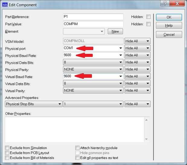 Haga clic derecho en el dispositivo COMPIM y en el formulario, establezca el puerto COM y baudios velocidad como se muestra.