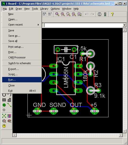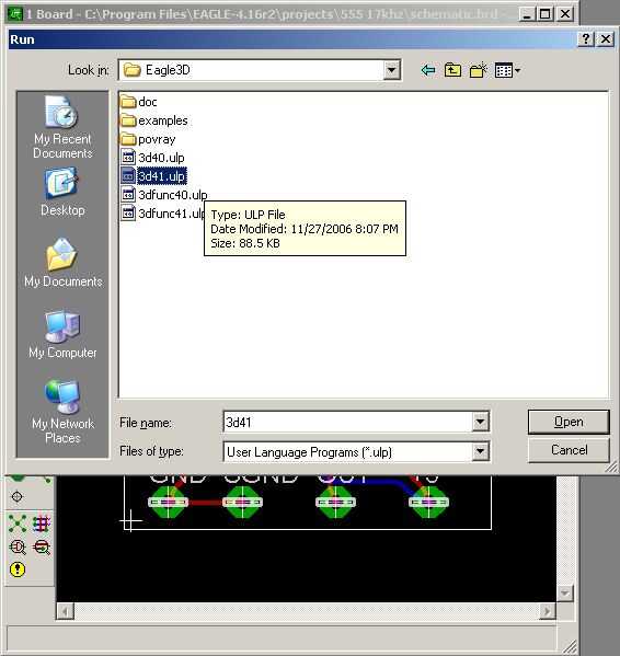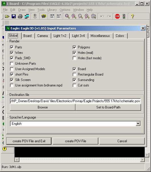 Después de instalar el software necesario, usted necesita generar un archivo POV que es leído por el POV-Ray. Para hacer esto, abrir la placa en EAGLE. A continuación, haga clic en archivo > Ejecutar. Quiere encontrar el directorio de instalación de Eagle3D y encontrar donde están almacenados los archivos de la ULP (mina fueron almacenado en C:\Program Files\Eagle\ULP\Eagle3D). Si tiene una versión del águila después de 4.1 x, usted querrá seleccionar 3d41.ulp. Si no es así, seleccione 3d40.ulp. Haga clic en abrir y una interfaz de generación de archivo deben saltar. Esto es donde haces tus selecciones en cómo se verá la tabla procesada. Generalmente dejo la configuración a la posición predeterminada, a menos que estoy usando custom creado piezas. Haga clic en salida y POV crear archivo. Debe aparecer un mensaje diciendo que el archivo de punto de vista se ha creado con éxito.