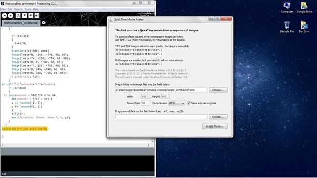 Ahora que hemos escrito el código, es hora de hacer un video de ella. Esto es muy simple y puede hacerse desde la propia aplicación de procesamiento. En primer lugar introducir esta línea al final de la función de drenaje (saveFrame("Frame/###.png");). Lo que esto hace es que cada vez que ejecuta la función draw captura el marco visual en un archivo PNG y guardarlo en una carpeta con el nombre marco en la misma carpeta donde está guardado el código. Para crear una película vaya a la aplicación de procesamiento luego herramientas--> Movie Maker. Proporcionar la ubicación de carpeta de marco y añadir cualquier audio si quieres. Adjunto captura de pantalla de este paso en las fotos anteriores.