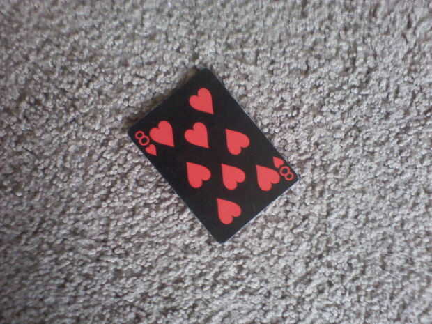 Extender las cartas y tiene uno de la media. (Cuadro 1) El que elegí fue el ocho de corazones. La cubierta de la Plaza de (cuadro 2). Su espectador poner su tarjeta en la parte superior la cubierta (Foto 3) y corte la baraja. (Imagen 4)