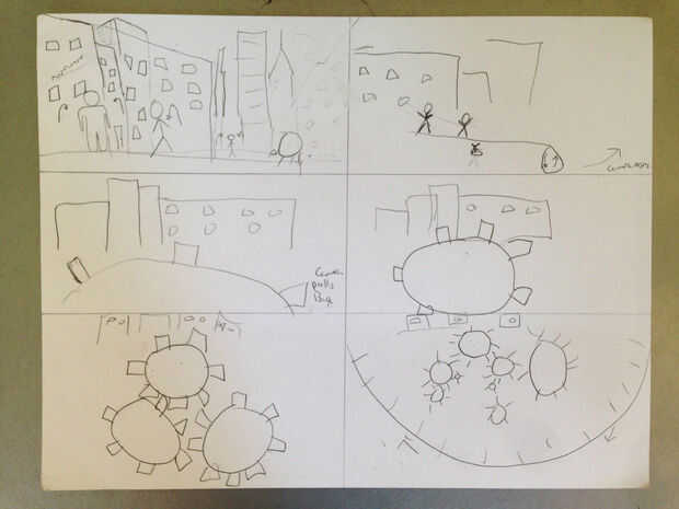 Empezamos con un rollo de papel y algunas figuras de palo; a maquetas de dientes pegadas a un barril de cerveza (que de alguna manera lo hizo en la escena) y engranajes pegados juntas de papel. No ven muy bien, pero es esencial para determinar la geometría, la escala y la funcionalidad de esta animación.