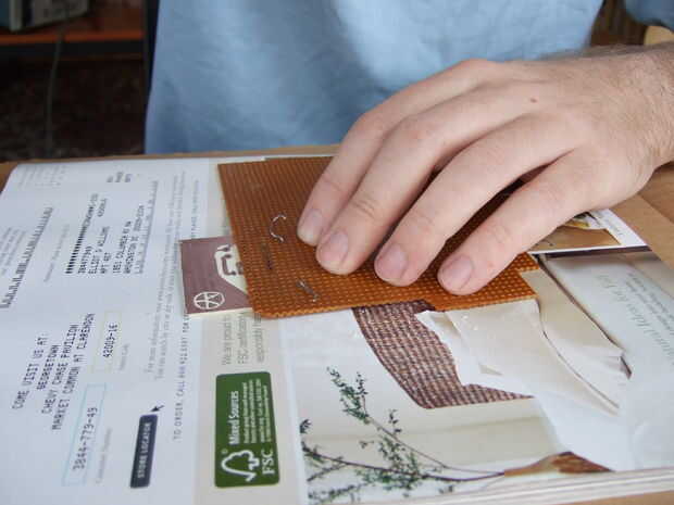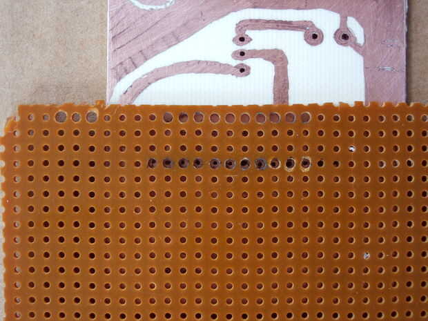 El perfboard, excepto que esta vez como una plantilla para taladrar. Alinee los orificios para que puedes ver los puntos en ellos, luego perfore los pines superiores e inferiores, igual que cuando les de la marca. Ahora usted puede pegar algo en los orificios para mantener la plantilla y Junta Directiva alineada. Usé algunos soldadura que estaba ahí. Componentes gruesos cables o alambre de conexión funciona bien también.