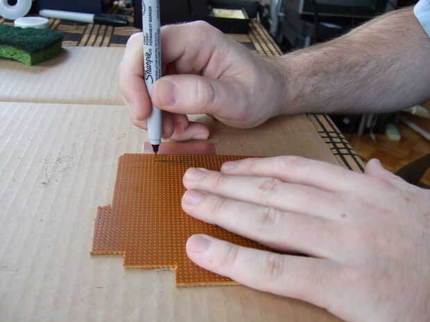 Con su sección de perfboard y el sharpie punta ultra fina, colocar los agujeros para todos sus componentes como se trabajó hacia fuera en el papel, en la imagen del espejo si usted hizo una.