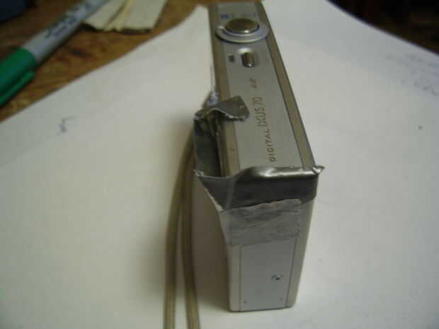 Esta es la parte simple - un poco de papel de estaño para reflejar el flash de la cámara hacia adelante (ish) en lugar de recto hacia abajo de la cinta. Sin embargo, el ángulo de la hojalata es crítico para obtener resultados consistentes (si quitarlo y reemplazarlo más adelante los resultados será diferentes si no es exactamente el mismo) y la luz no debe salir de los lados ya que afecta dramáticamente el resultado final.