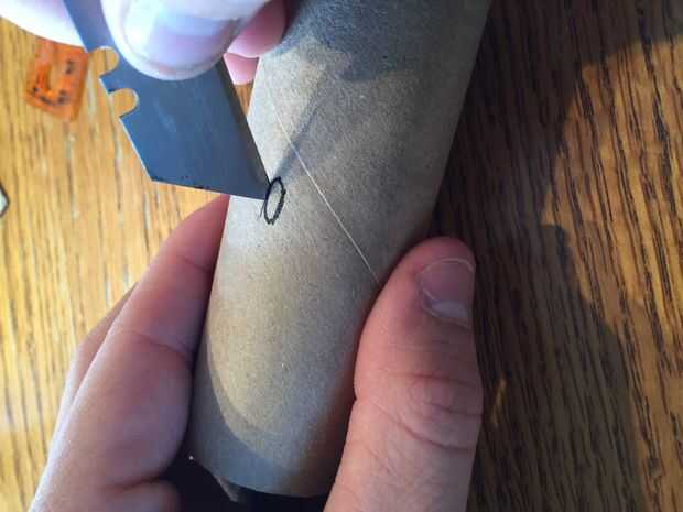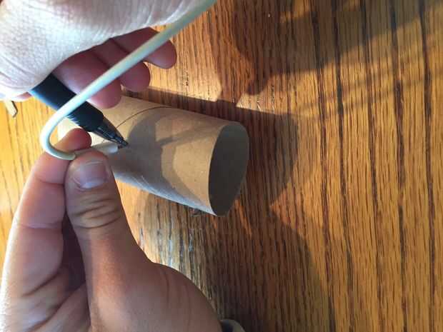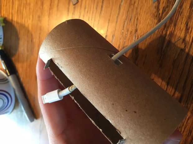 Repita los pasos uno y dos, pero trazar su cargador del teléfono en vez del telefono, seguimiento de cerca de 90 grados alrededor del rollo de la ranura del teléfono. Este agujero no tiene que ser de la misma forma que el cargador del teléfono. Puede ser cualquier forma cerca del tamaño del orificio necesario para que el extremo del cargador caber a través.