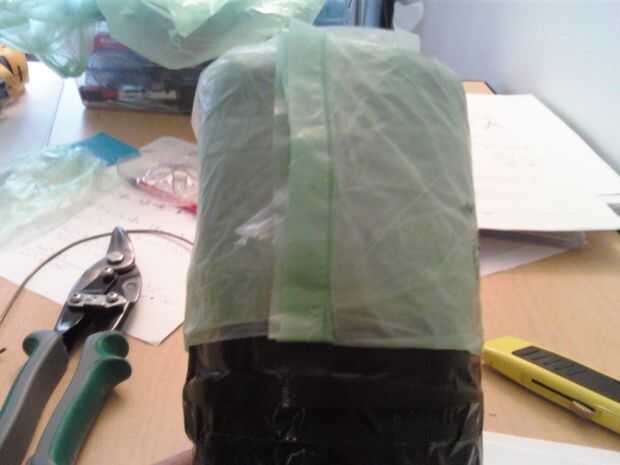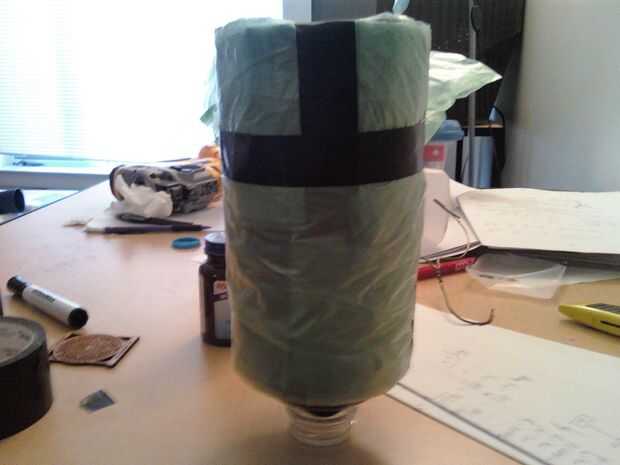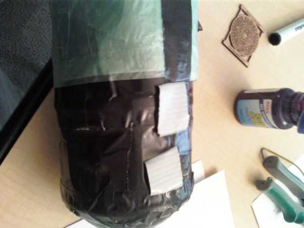 Utilice la cinta de conducto para formar 2 circuitos con el lado pegajoso hacia afuera y colocar aparte con respecto a uno a cerca de 1 pulgada y 1 pulgada de la parte inferior de la botella. Pegar un extremo de la bolsa en las piezas de la cinta y empezar a envolver alrededor de la botella. En el extremo de la bolsa, sellarla con otro pedazo de cinta adhesiva en el exterior o puede utilizar otro 2 lazos de cinta para pegar en la parte inferior de la capa de plástico.