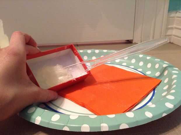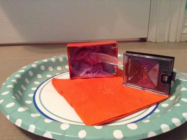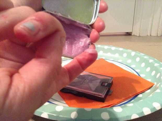 Empezar por sacar de su caja de joyería o el envase de menta. Luego, raspar su vaselina o jalea de petróleo en el depósito de casa de la moneda o joyas. Luego raspar aproximadamente 1/4 de la paleta de sombra de ojos en la mezcla. Por último, mezclar y aplicar!