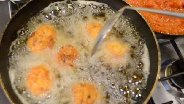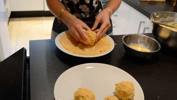 Con las manos mojadas se reúnen a una porción del tamaño de una pelota de billar de la mezcla y formar una bola – hacerlo tan suavemente como sea posible para no comprimir demasiado la pasta. Cubrir la bola en el huevo y tapa de migas de pan y reservar. Calentar un recipiente con bastante aceite a mitad de camino hacia los lados de las bolas. Calentar a 180C y freír algunas de las bolas, como marrón. Después de 5 minutos o hasta que se oro marrón y firme, quitar y drenan en el rodillo de cocina