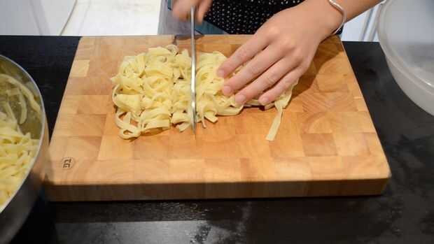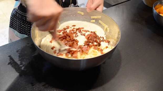 Cuando los tagliatelle esté lo suficientemente frío como para manejar, cortar en piezas relativamente cortas y en un tazón grande. Añadir la bechamel y bacon/picada. Si usted piensa usted puede tener demasiada bechamel para la mezcla o es demasiado fina, agregar una cucharada a la vez. Necesita una mezcla bastante espesa con la pasta hacer bolitas para no añadir la salsa a la vez y se hagan demasiado chapuza