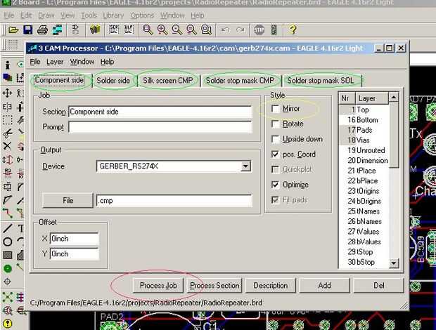 Esta es la parte importante. Usted necesita hacer clic en cada una de las pestañas un círculo verde y espejo (un círculo amarillo) esté apagado. Al hacer clic en a través de las pestañas te darás las líneas Nr y capa resaltadas a la derecha va a cambiar. Un defecto que puede cambiar valores de los componentes - en mi copia que esta fue desactivada y la pantalla de seda terminada con U20 pero no el chip real - por ejemplo, un CI puede ser 74HC04. Clic en las pestañas de seda pantalla Cmp y 27 tvalues. Una vez que todas las casillas espejo definitivamente desactivadas, haga clic en proceso de trabajo (círculo rojo).