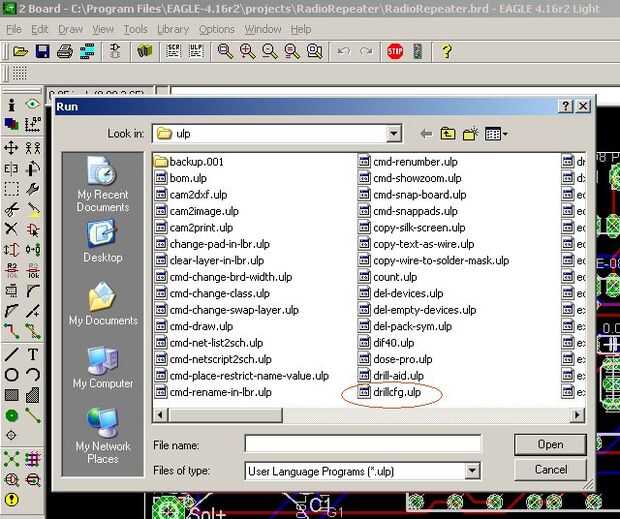 El fabricante necesita saber qué ejercicios utilizar. Águila ha utilizado automáticamente cualquier taladro ajusta a los componentes que han sido elegidos. Ir a archivo/ejecutar y seleccione el archivo "drillcfg.ulp". He seleccionado pulgadas en lugar de mm y que parecía muy bien con el fabricante. Haga clic en aceptar y luego ok nuevamente. Guardará un archivo con una extensión de DRL.
