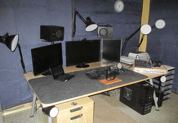 Usted podría notar algunas cosas en la imagen. Debido a la relación de aspecto 16:9 usará pronto, he añadido dos más luces motor fuera de borda para el fondo de 12 pies. Que podemos hacer para cerca de $12 por luz es bastante dulce. Las paredes a mi alrededor tienen postes de 2 x 4 frente a las ventanas y paredes para colgar las mantas móviles. Un tornillo fue puesto en la parte superior de los marcos de ventana donde no muestran después de esto se toma. Esto realmente mató a los ecos en una habitación que es de piedra y vidrio. Las mantas móviles son aproximadamente $15 una pieza para un 4 x 8' y se viraron justo hasta las falsas paredes de 2 x 4.