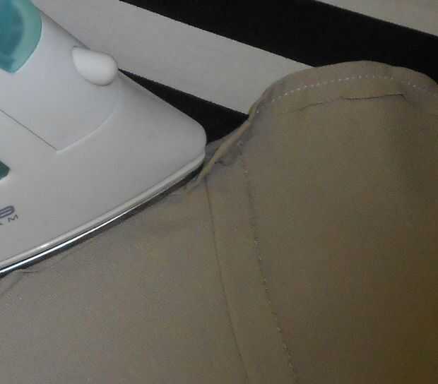 Tomar la plancha, calentar para arriba y utilizando la nariz doble la tela doble para obtener la cantidad correcta. Para los pantalones, cosió una hilvanado puntada aquí en la marca de 1/4 de pulgada para todos ver para tener una idea de donde es la marca de media pulgada. En general, la marca de 1/2 pulgada que es común a la mayoría ropa de verano y pantalones es el ancho de una plancha casera (mostrado aquí). Puede ser un poco más o menos mientras golpeas más o menos la marca. Prender con alfileres el dobladillo como vas a evitar que se caiga.