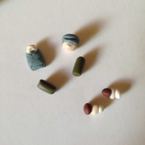 En las piernas: el color verde oliva y dos cilindros del mismo tamaño que hicimos el sombrero de Layton. Para sus piernas y brazos, proceder con el mismo método de apilamiento como se describe antes.
