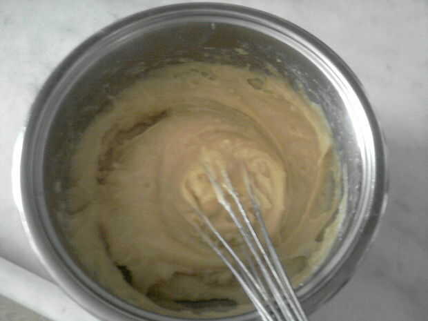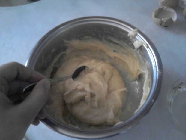 pasta choux: 100 gr. mantequilla, 250ml leche y 160 gr. harina, 4huevos. 500 ml. Nata. Hornear y rellenarPaso 1: Masa escaldada Se pone al fuego la mantequilla con la leche se remueve con cuchara de madera.Paso 2:Se añade de golpe la harina y se remu