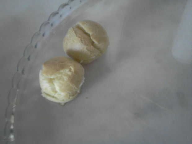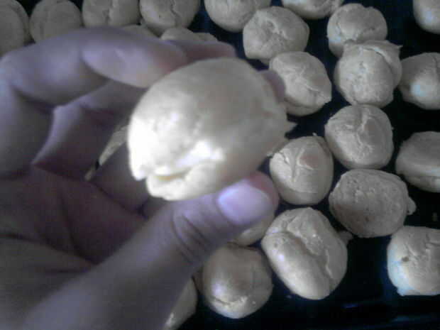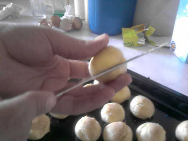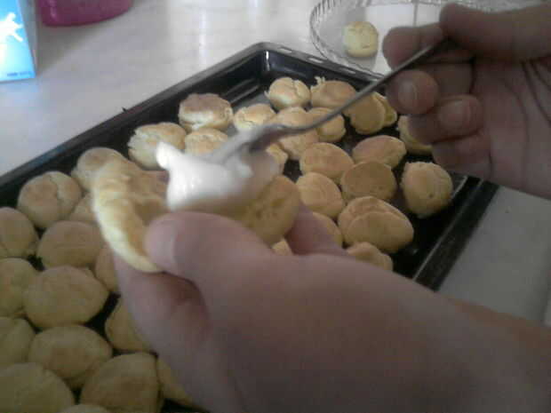 pasta choux: 100 gr. mantequilla, 250ml leche y 160 gr. harina, 4huevos. 500 ml. Nata. Hornear y rellenarPaso 1: Masa escaldada Se pone al fuego la mantequilla con la leche se remueve con cuchara de madera.Paso 2:Se añade de golpe la harina y se remu
