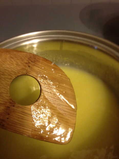 Agregue la mantequilla y revuelva constantemente hasta que la mezcla de cuajada caliente y a dormir la siesta la cuchara. Si te raen't estoy seguro qué hap significa, ver la foto. Usted puede decir que es el espesor correcto cuando ejecuta su dedo a través de la película en una cuchara deja un rastro. Esto le llevará unos 4-5 minutos