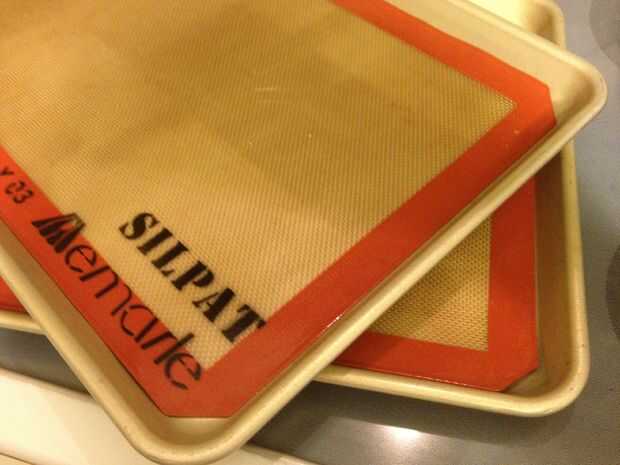 Línea dos media hoja sartenes o grande para las galletas con papel sulfurizado o silpat.