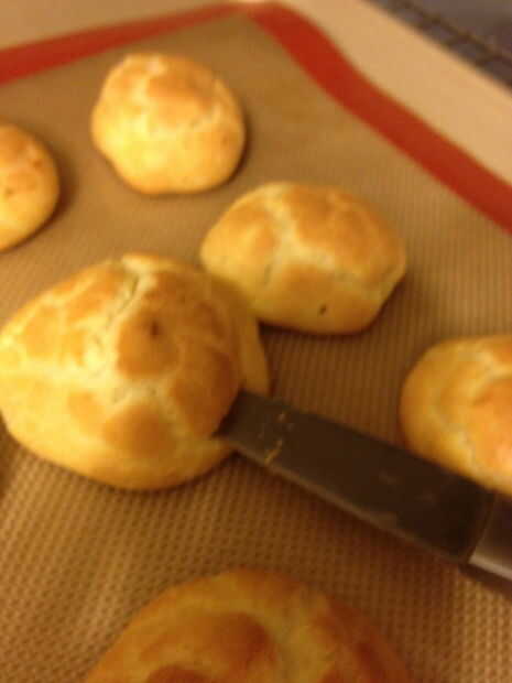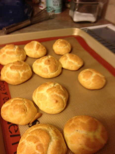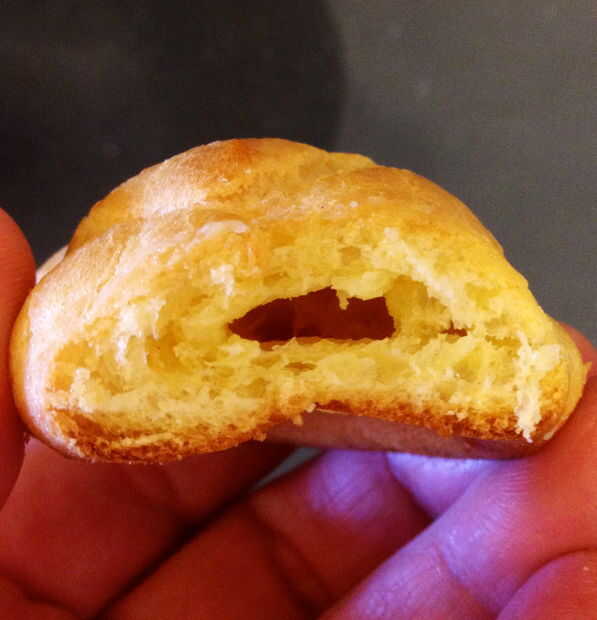 Cocinar para un total de unos 25 minutos. 10 minutos después de poner en el horno, gire que la cocción hojas alrededor de modo que calientan se distribuye uniformemente. La masa está cocida cuando esté dorado por encima. El centro de la masa debe ser hueco al corte abierto, esto es lo que permite a éstos a ser llena, en este caso con un pastel de crema, pero deje su imaginación funcionar salvaje con lo que cada vez woud como llenar estos!