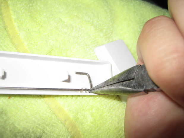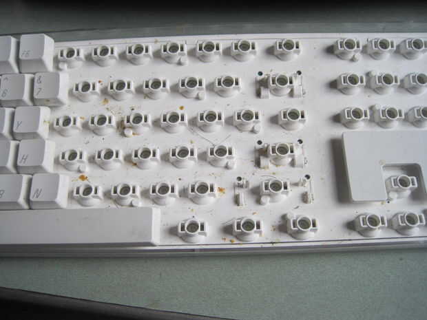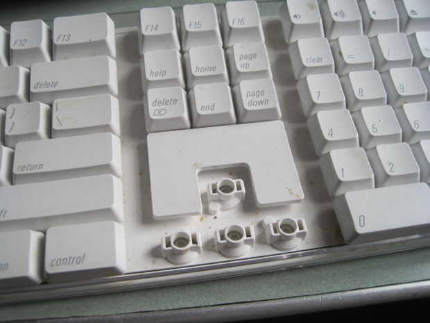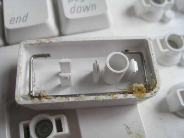 Tomar especial PRECAUCIÓN al quitar las teclas de ancho (barra espaciadora, tecla de retorno, tecla de borrar, etc.). Hay clips de metal debajo de ellos. No doblar estas o tus pulsaciones serán obstaculizados. Retire con cuidado los sujetadores metálicos con las pinzas pequeñas cerca de las bisagras. Recuerde que el clip de metal va con que tecla. También observar cómo funciona el clip de metal. Esto le ahorrará el problema cuando tienes que volver a montar las teclas. Hacer no lavar los sujetadores metálicos.