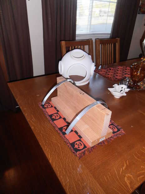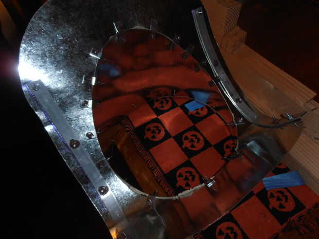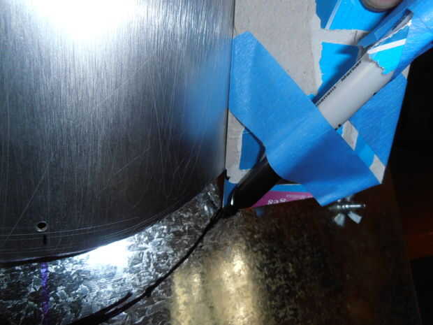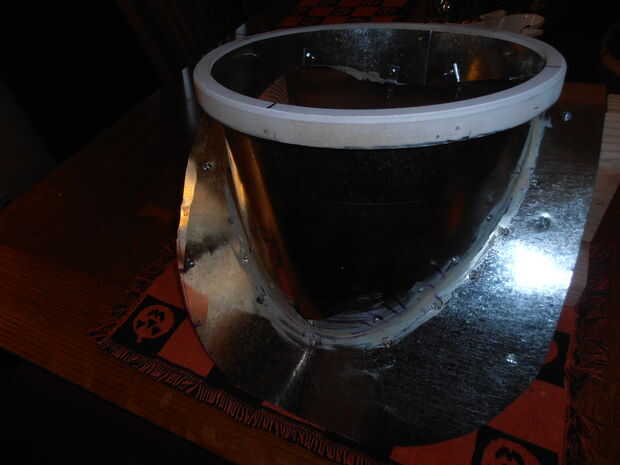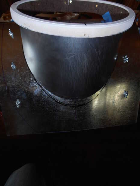 Hacer el babero habría sido mucho más rápido si podía recordar las ecuaciones trigonométricas que se utiliza para dibujar un círculo en una pendiente. Ya que no pude, fui por delante y había montado un rotulador a un borde recto y utiliza para marcar mi linea en el galvanizado. Después de todo recorte con unas tijeras adelantó y todos mis agujeros marcados y perforados hacia fuera. Utilicé tornillos con tornillos para montar el babero a los soportes de aluminio y para montar los codos poco 1/2" para unirse al babero y el collarín. No tengo ningún locktite usé algunas de mis uñas del dedo sirenas. Después de todo estaba seco usé una amoladora para eliminar todos los tornillos en exceso. También me regaló un pequeño espacio de 1/32 a 1/16 en la costura, donde conoció al collar babero. Voy a cubrir esta zona pero quería que fuese sólido cuando Pinto lo utiliza clavos líquidos parece alrededor de la capa de contacto.