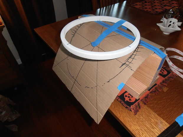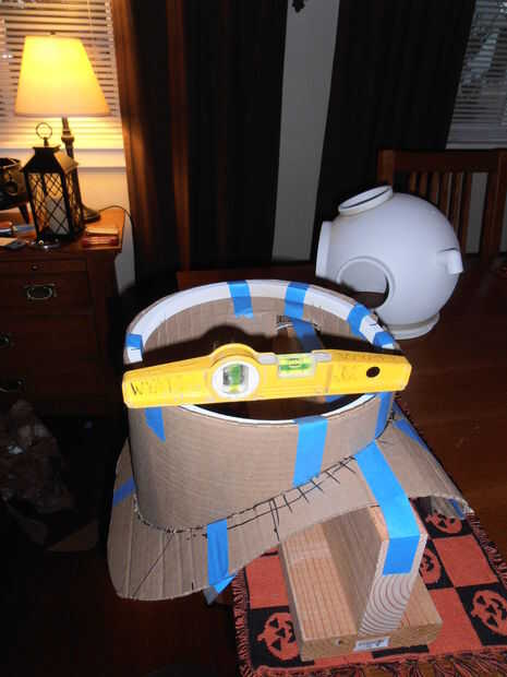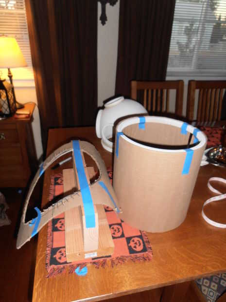 Pero primero hice un soporte para sujetar el collar en su lugar mientras trabajaba en él. También utilicé las tiras de aluminio para montar el babero con el fin de mantener su forma y dar apoyo. Dobló el aluminio para que coincida con el contorno de mis hombros, por lo que sería cómodo de llevar. Montara el cartón hacia el exterior del adaptador de cuello MDF y luego de realizar el modelo laminado y montaje, el cuello parecía a voluminosos por lo que cuando lo hice una segunda vez con el galvanizado montara el galvanizado dentro del collar MDF. Puesto que el galvanizado aumentó el diámetro interno del cuello esto hizo para los cascos adaptador de cuello MDF no se sentaría en el babero que tuve que rebaje los cascos cuello a adaptador mientras que estaba pegado y perno clavado en el casco (poco nervio demolición). Hizo el casco caben holgadamente en el collar usé para ayudar a fijarlo dos pins linch de latón en cada lado que le dio una mirada agradable.
