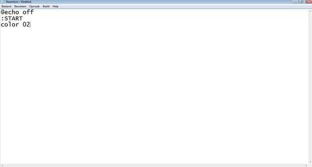 Por supuesto cualquier texto matriz debe ser verde! El código sólo funcionará si se escribe la manera americana, de color. Si eres inglés... sorry :-( El 0 es negro y verde 2. El primer número es para el fondo y el segundo es para el texto.